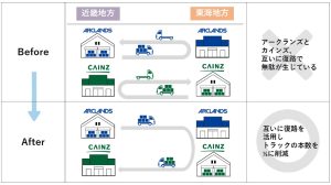 アークランズとカインズにおいては、これまで各社の物流センターから自社店舗へ納品した後、復路は空車のまま各社の物流センターへ戻る運行がありました。今後は、各社の店舗への納品後に協業先の物流センターで荷物を積載し、協業先の店舗へ納品したうえで自社の物流センターに戻る運行へ切り替え、復路の相互活用によるムダの少ない輸送を図ります。